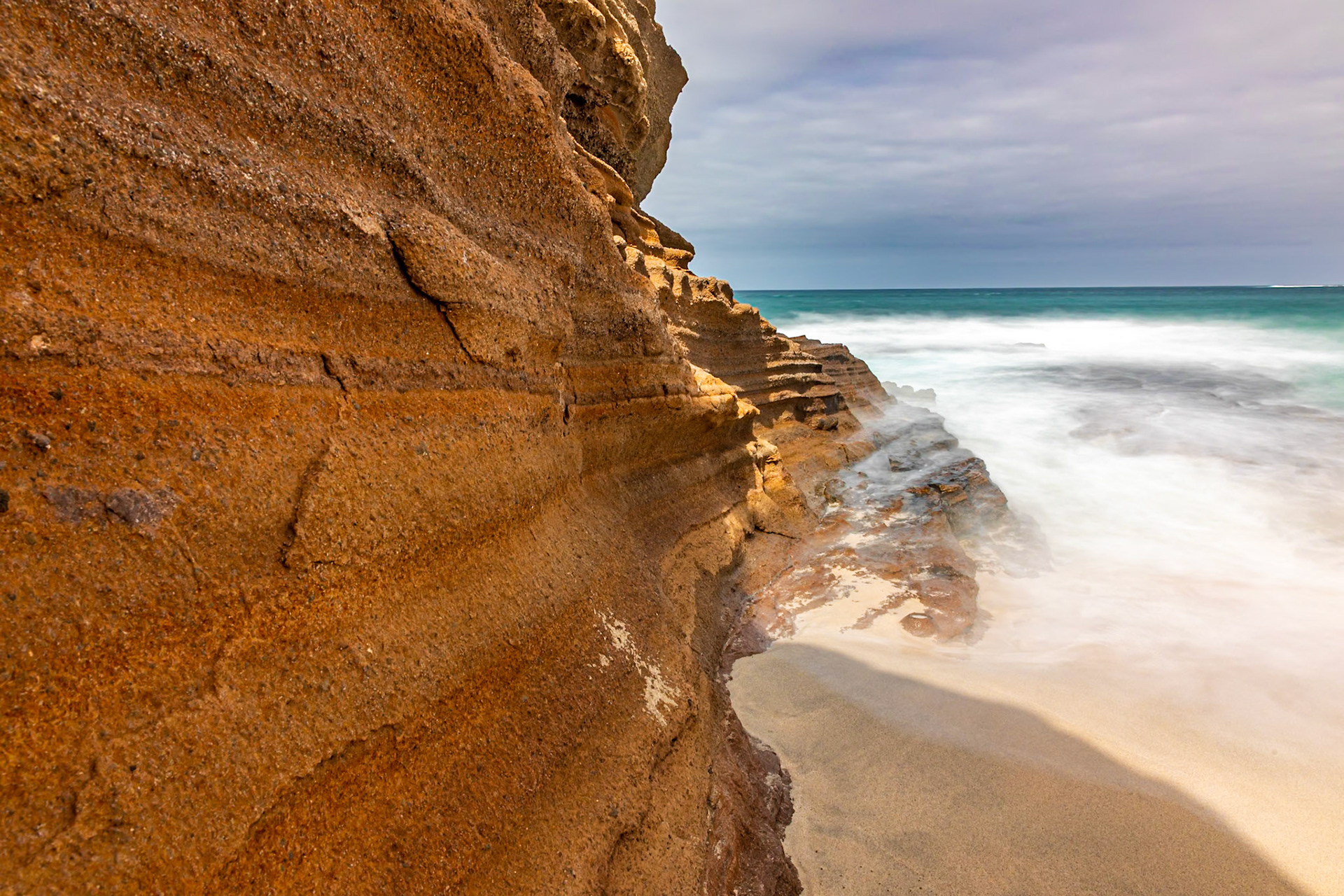 A sandstone wall formed through erosion at a small beach on the Jandia peninsula.